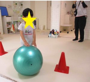 ボール転がしでは、大玉が手元から離れないように目で追うお友達!次のお友達のところまで手で転がすことが出来ました☆