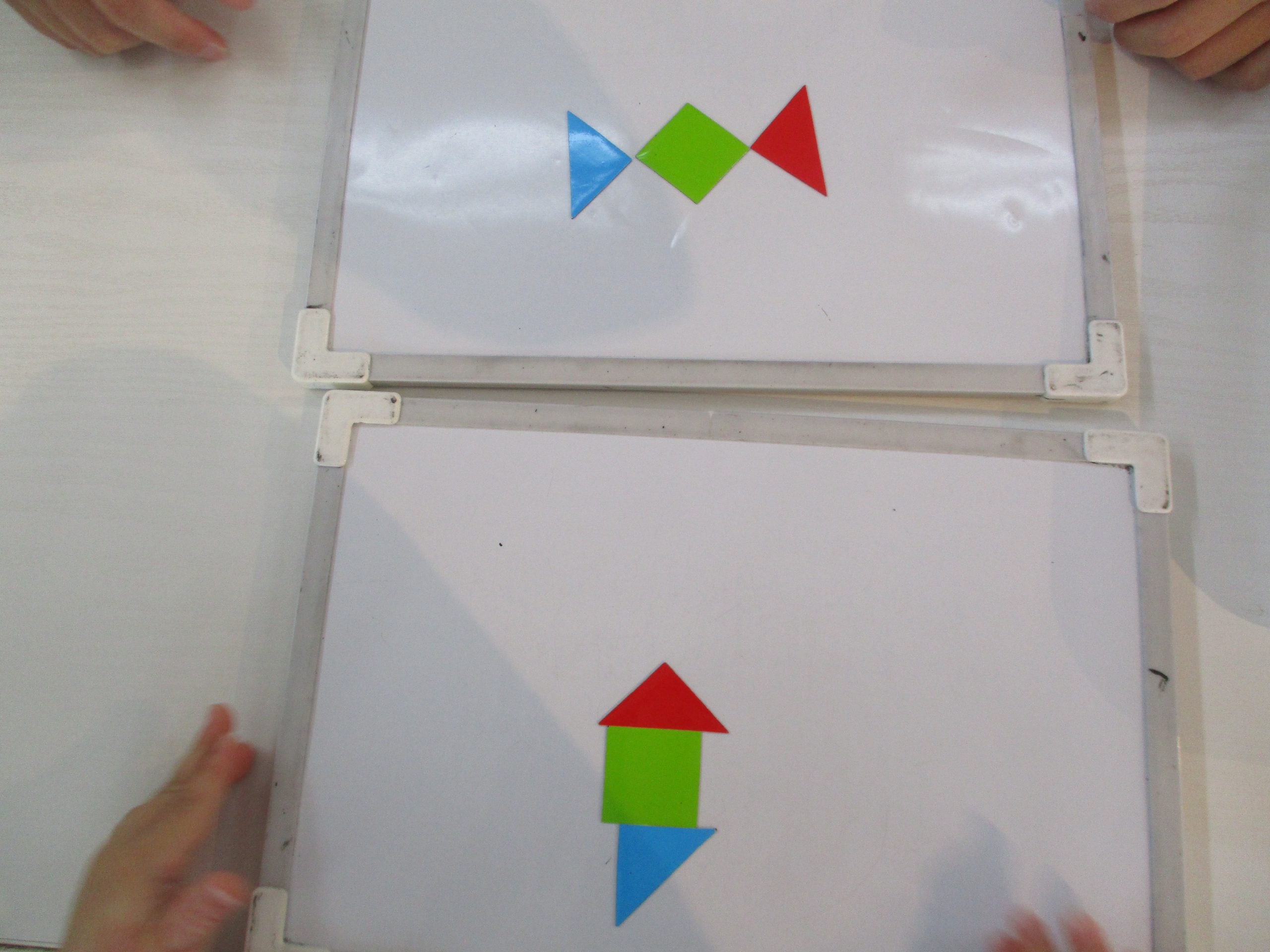 小さなお友達のグループは、図形の色や形を示した台紙の上に磁石をマッチングしてもらいました。2つの磁石をピッタンコ♪3つになると難しくて困り顔になっちゃうお友達もいましたが、職員と一緒に磁石をクルクル~と回して見事にピッタンコ♪とっても上手に出来ました☆大きなお友達のグループには職員がつくったお手本を見て同じ図形をつくってもらいました。「できたー!」と発信があり職員が確認してみると…あれれ?お手本とちょっと違うみたいだね!職員と一緒に、こうかな?こっちだね!と言いながら、もう1度チャレンジすると上手にキャンディーが出来ました☆お魚やお家、ダイヤモンドなど色々な形を完成させることが出来ましたよ♪