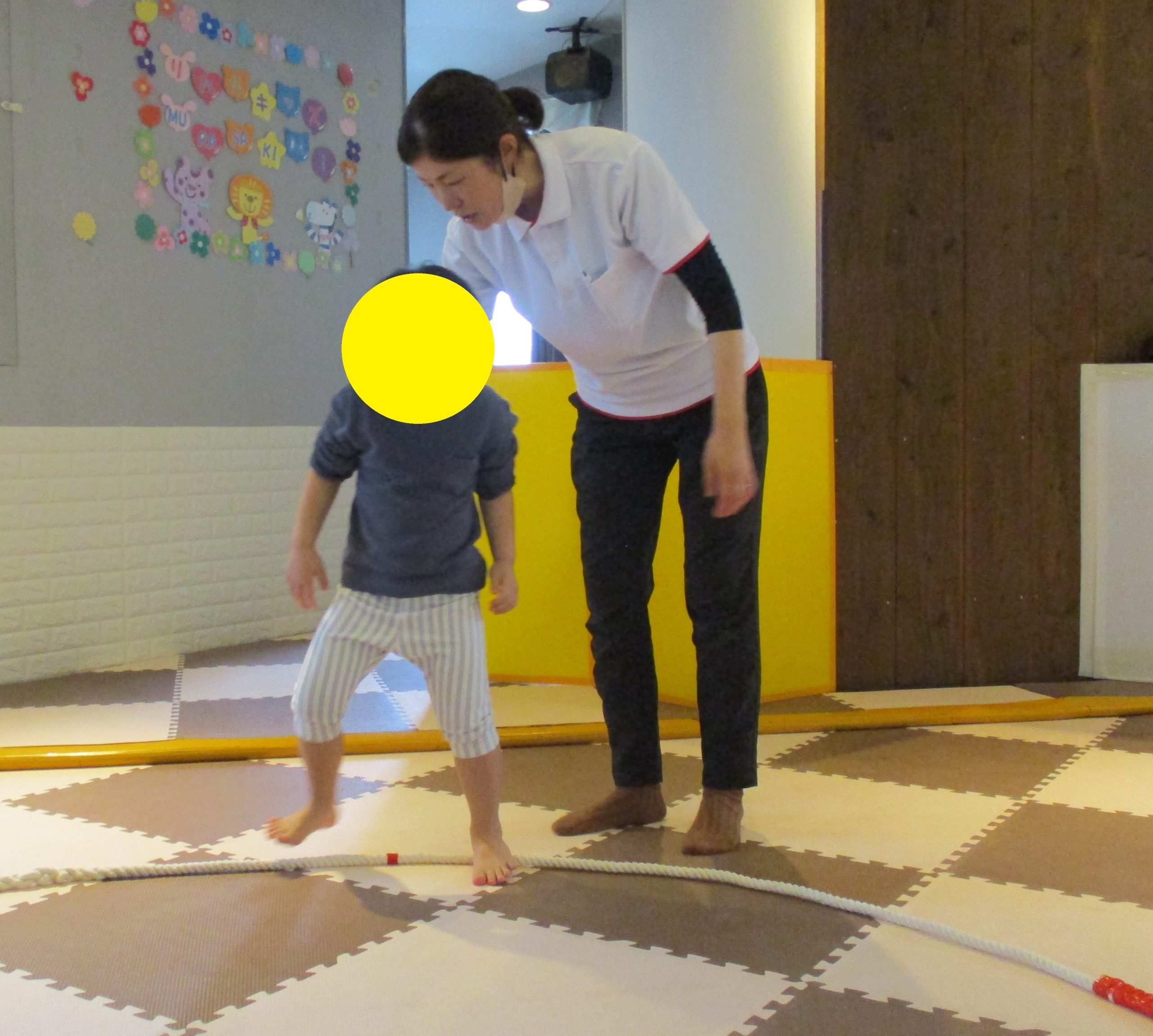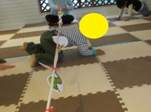 「〇〇カニさん!」と尋ねると子ども達は元気いっぱいにお返事の後、縄から落ちないように綱渡りを楽しんでいます。