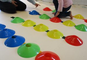 列に並んだ様々な色のマーカーコーンを、提示された色の列に並び変えていきます。