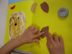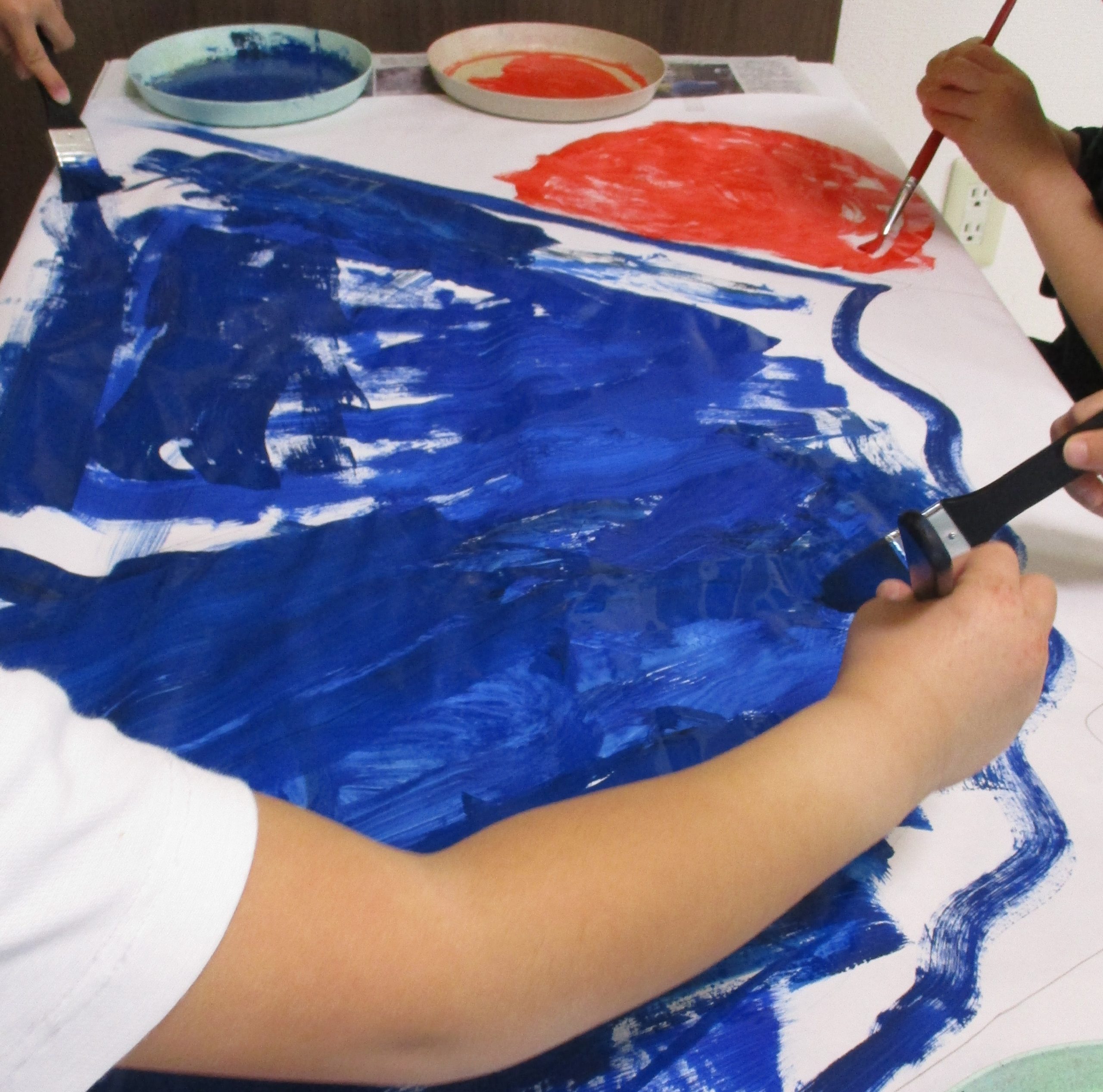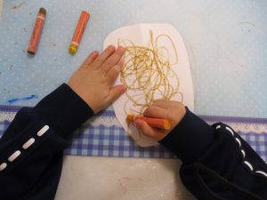 【目的】・クレヨンを3色使って模様を描く。イメージ力の向上。道具操作、力加減の仕方を学ぶ・でんぷん糊の使い方。様々な感覚を体験する。