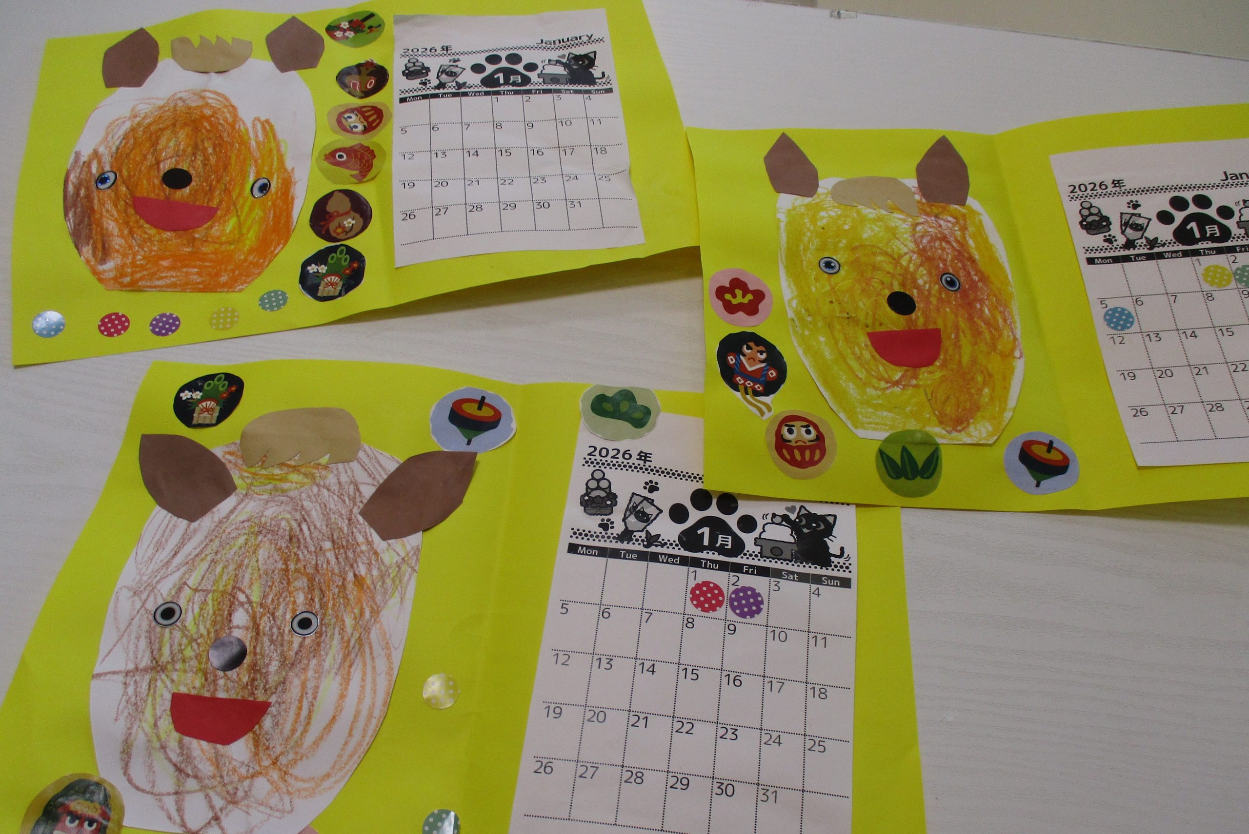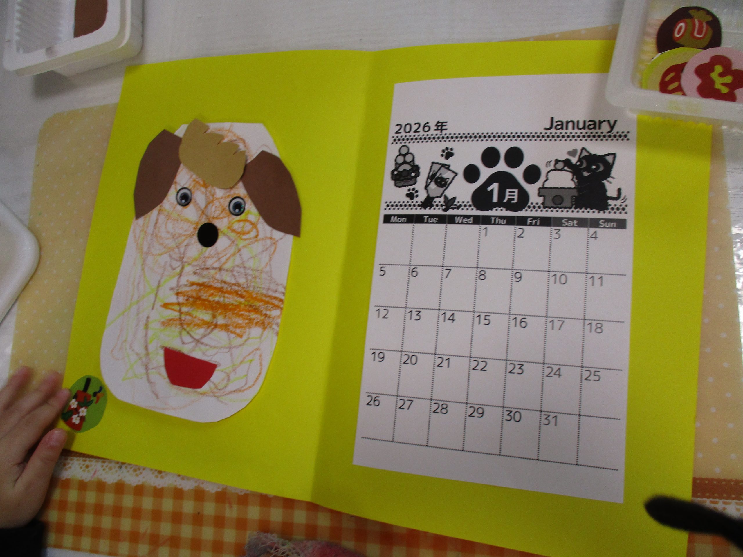 でんぷんのりを指で触ると「うわっ!べたべたしてる」と感触にびっくりすることもありましたが、「ぬりぬり、ぺったん」と様々なオノマトペが飛び交う中、お馬さんやお正月飾りに糊を丁寧にぬり、画用紙に沢山貼っていきました。出来上がったカレンダーにお友達もご満悦♡糊が乾いたら持って帰るのを楽しみにしていました(^▽^)