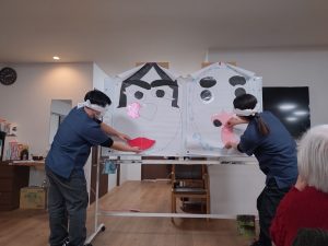 皆様「右!左!ちょっと上!違う反対!」と声をしっかりと出されていました。終わった後に気づいたことがあり、おかめにひょっとこの顔のパーツ・ひょっとこにおかめの顔のパーツとすべての顔のパーツが反対となっておりました。