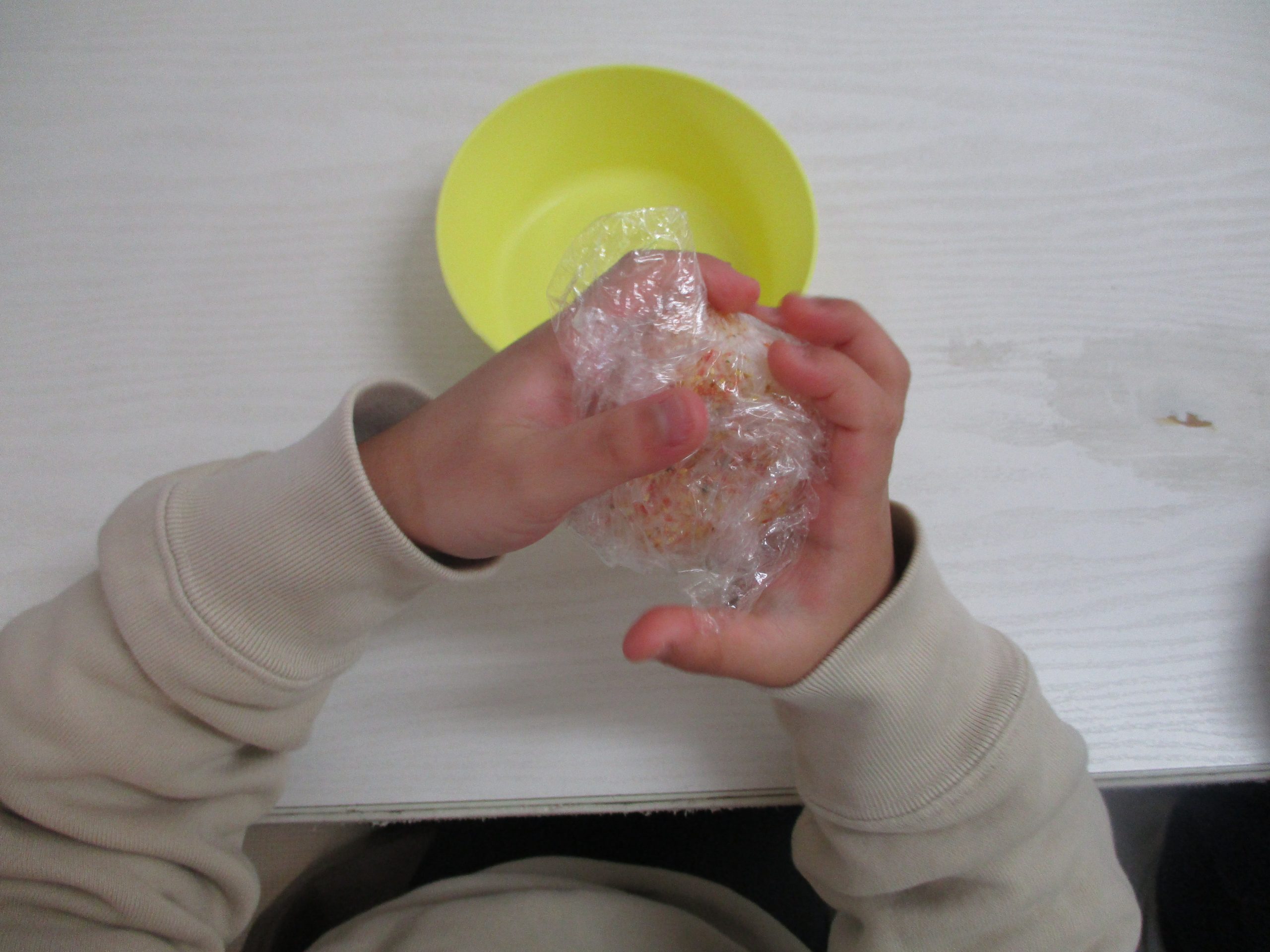 まず最初におにぎりってどんな形があるかな?と尋ねると、「さんかく!」「まる!」「しかく!」と色んな意見が飛び出す子ども達!