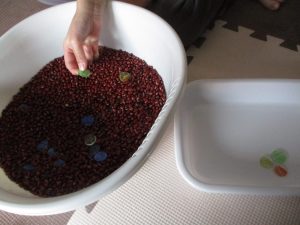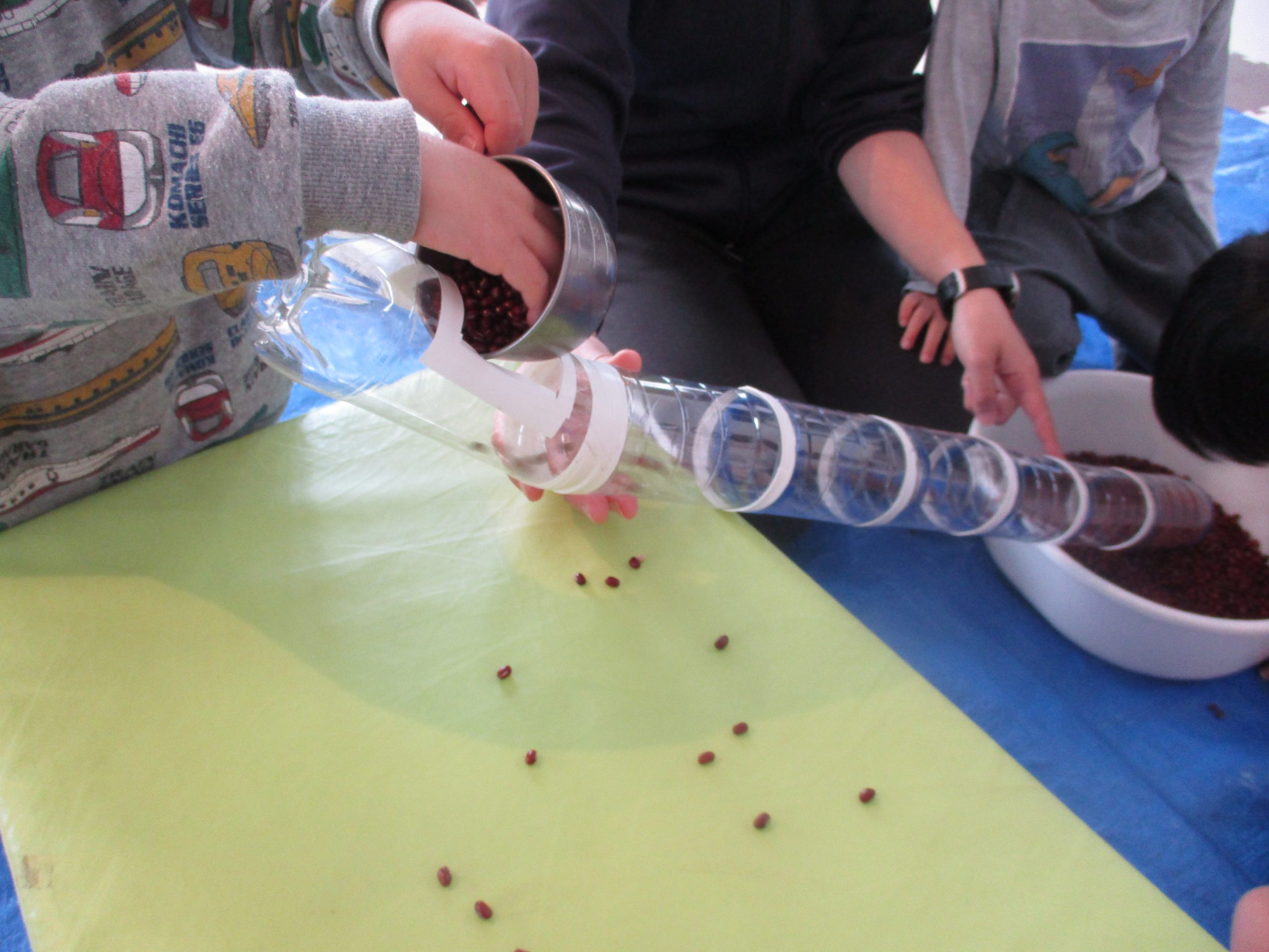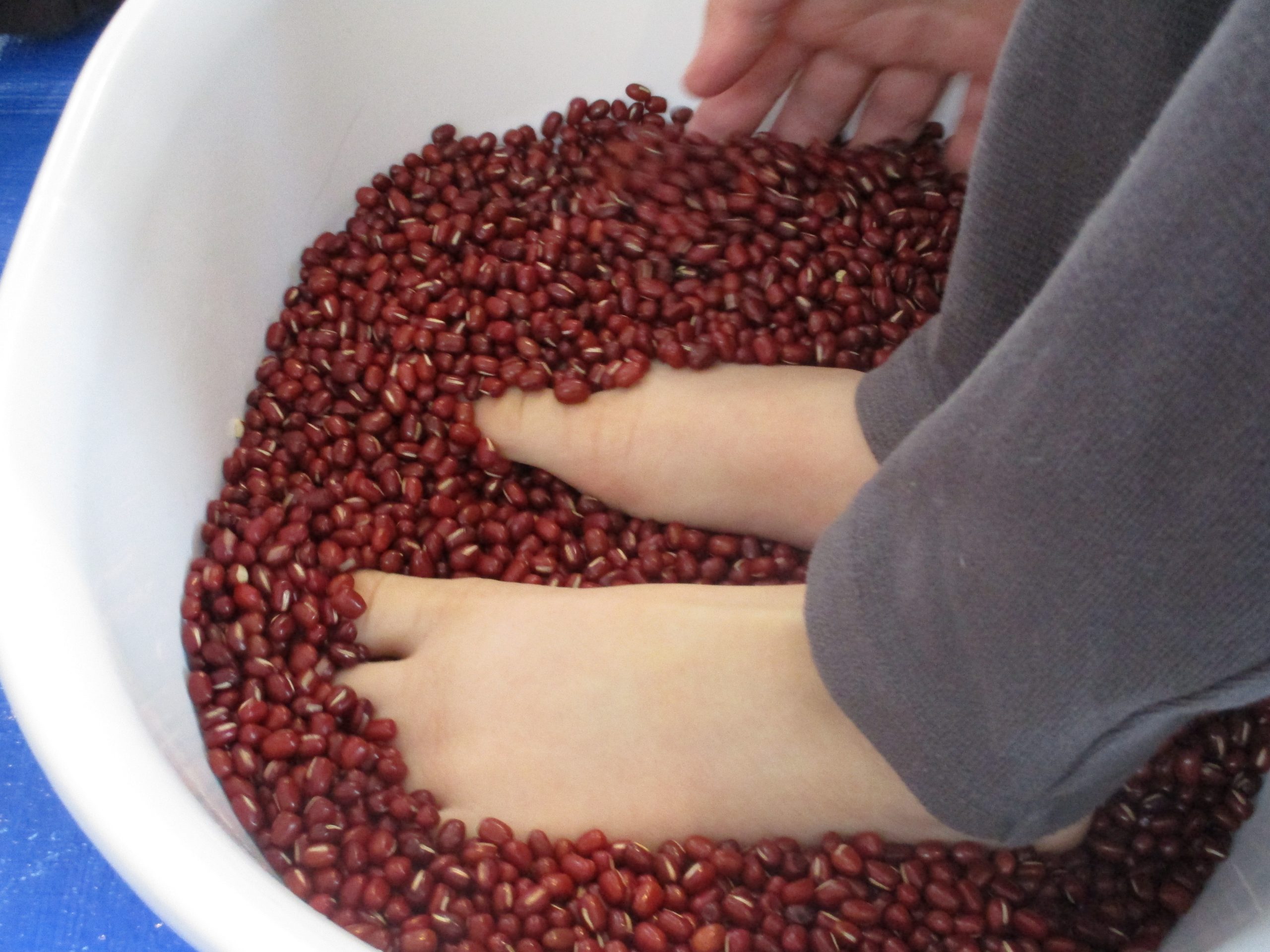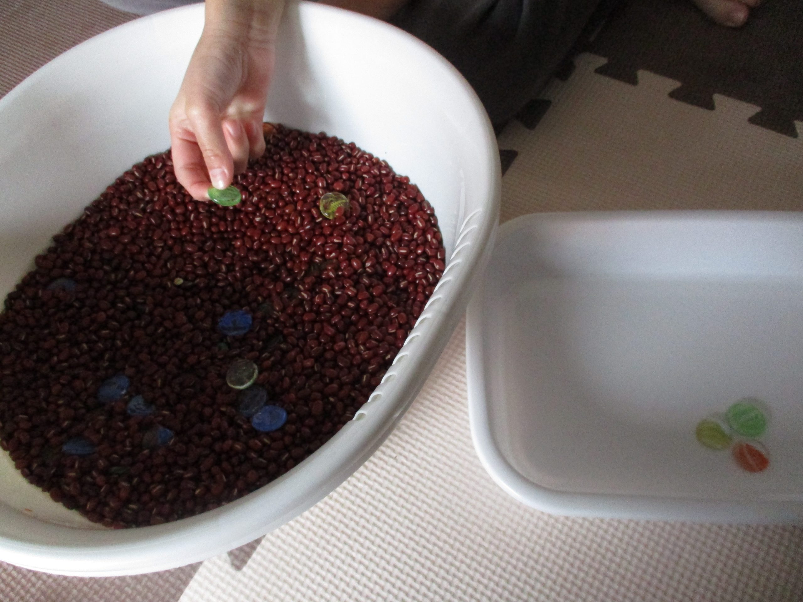 今日は小豆遊びを行いました。小豆を見てわくわく、早く触りたい様子のみんな(^^)触ってみるとどんな感じがするかな?「つめたい」と声が聞こえてきました。対照的に「あつい」と言うお友達もいましたよ♪足で踏んでみるとどうかな?くっついて気持ち悪い!?慌てて払いのけるお友達(>_<)おはじき探しにも挑戦☆たくさんの小豆の中から手探りでおはじきを探し指で掴みトレーに入れます。集中して探し、1番多いお友達は19個も見つけることができました!!最後はみんな大好きなスライダーです。容器からこぼれないようにスライダーへ入れ小豆が滑る様子を「キャー」と見つめ楽しみました☆