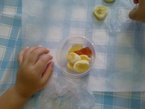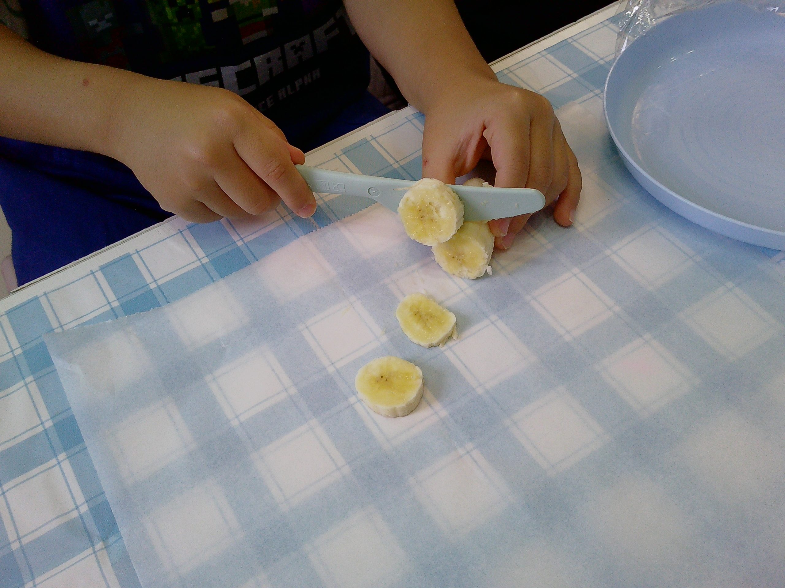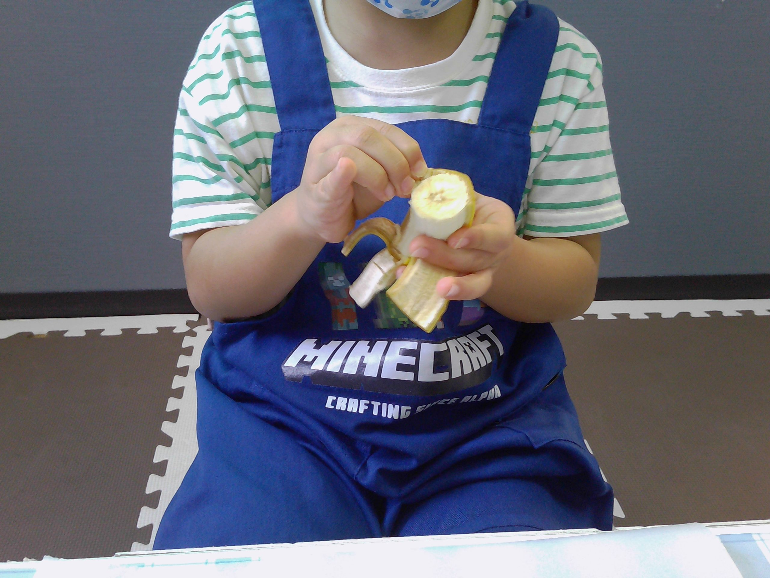 バナナの皮をむき、子どもたちは細かくスライスする子や大小さまざまな大きさで自由にカットしていきました。