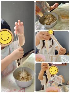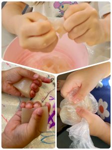 最後は糸こんにゃくも出てきて「くっさ」「びよーん!」「つぶれない!」「細いのに強い」など、子ども達から出てくる感想に職員のツッコミや笑いで楽しく感覚遊びが出来た時間でした♪