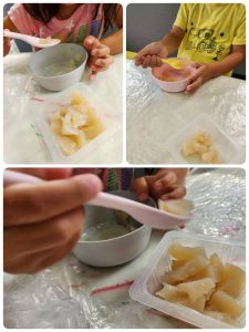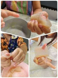 指先を使って各自ちぎっていきます!終わったお友達には同じ形のこんにゃくを渡します。すると「あれー!?」「あったかーい」「かったい」「やわらかい~」「ぷにぷに」あど、温度や感触の変化に気付いて盛り上がる子どもたち!