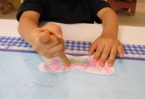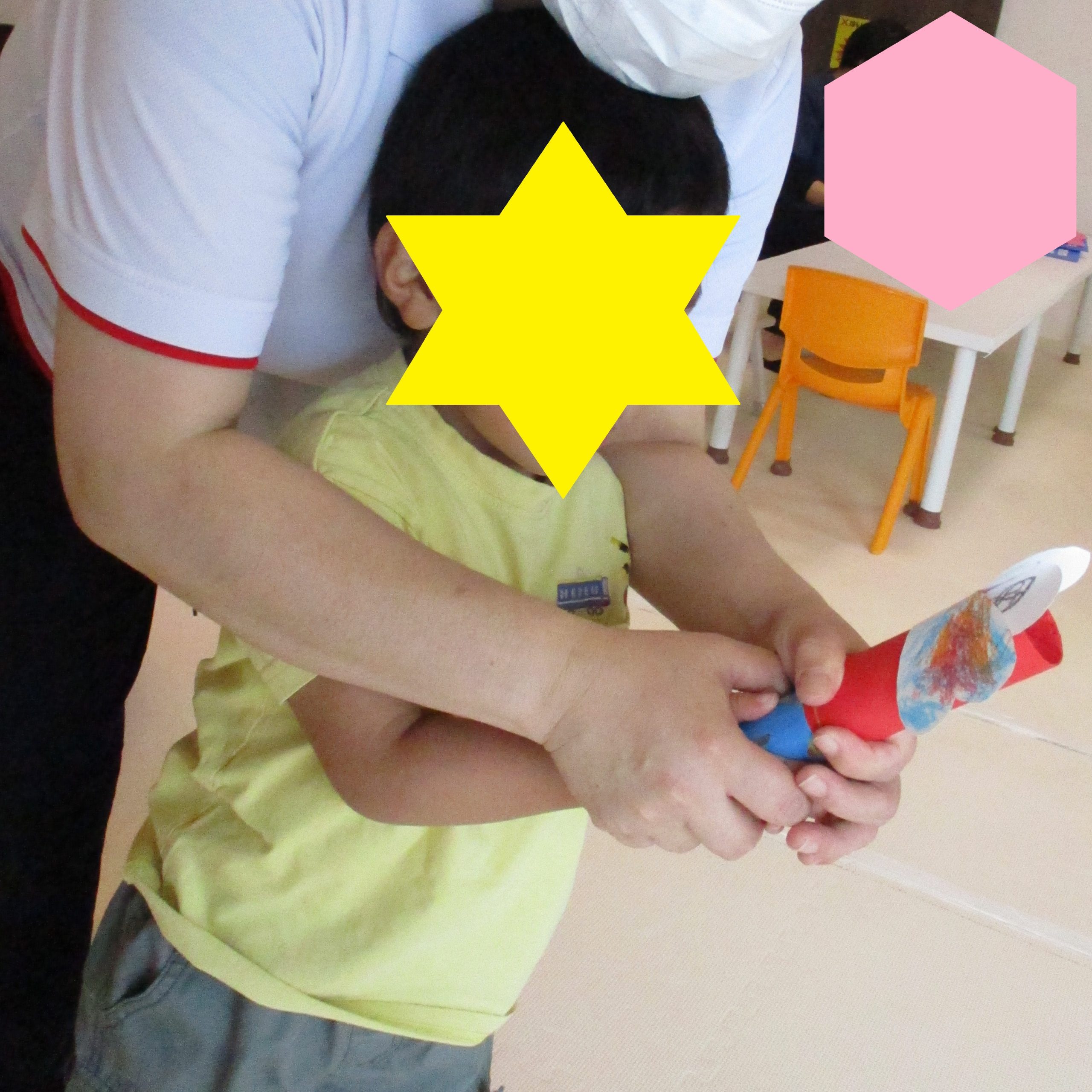 完成した作品はカラーコピー・ラミネートをして見本にすることで繰り返し作ることができたり、月齢の低いお友達も見本の上に重ねること