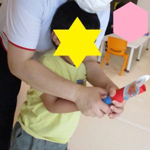 二本の異なる長さのスティックとジョイントを上手くつなげながら魚や猫、ブランコなど様々なものを作ることが出来ます☆彡輪っかにして扇風機に見立てたり、長くつなげて釣り竿にして魚釣りのように楽しんだり子どもたちの想像力にいつも驚きの職員一同です!!!!
