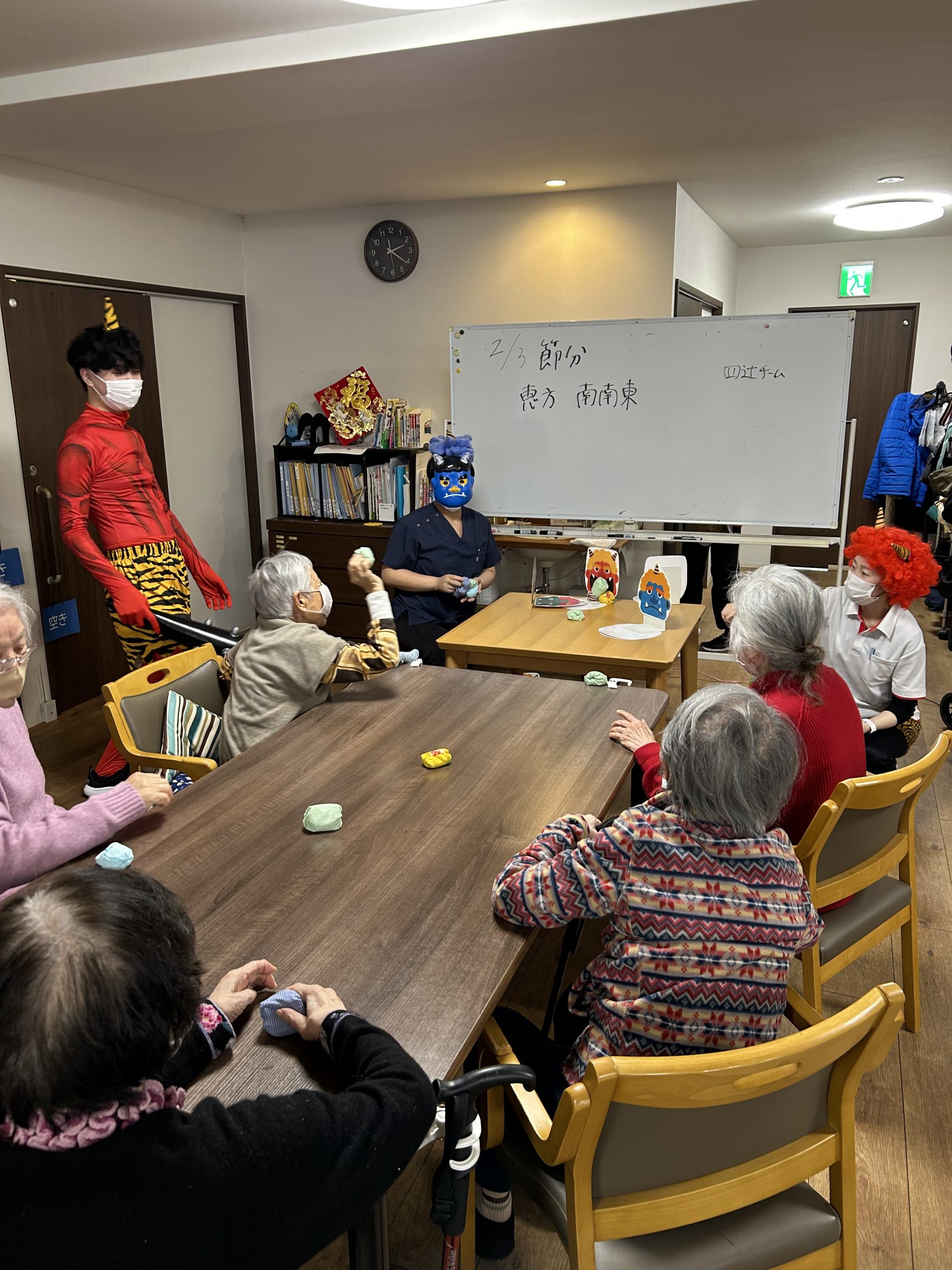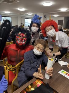 リアルな鬼も登場し、鬼退治や恵方巻き作りゲームを行いました。